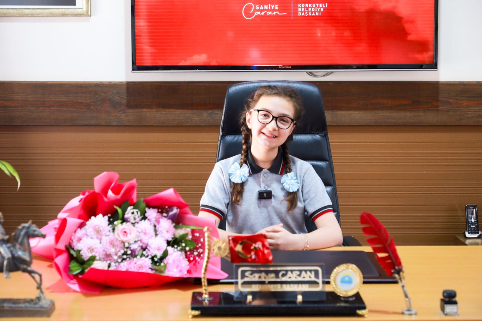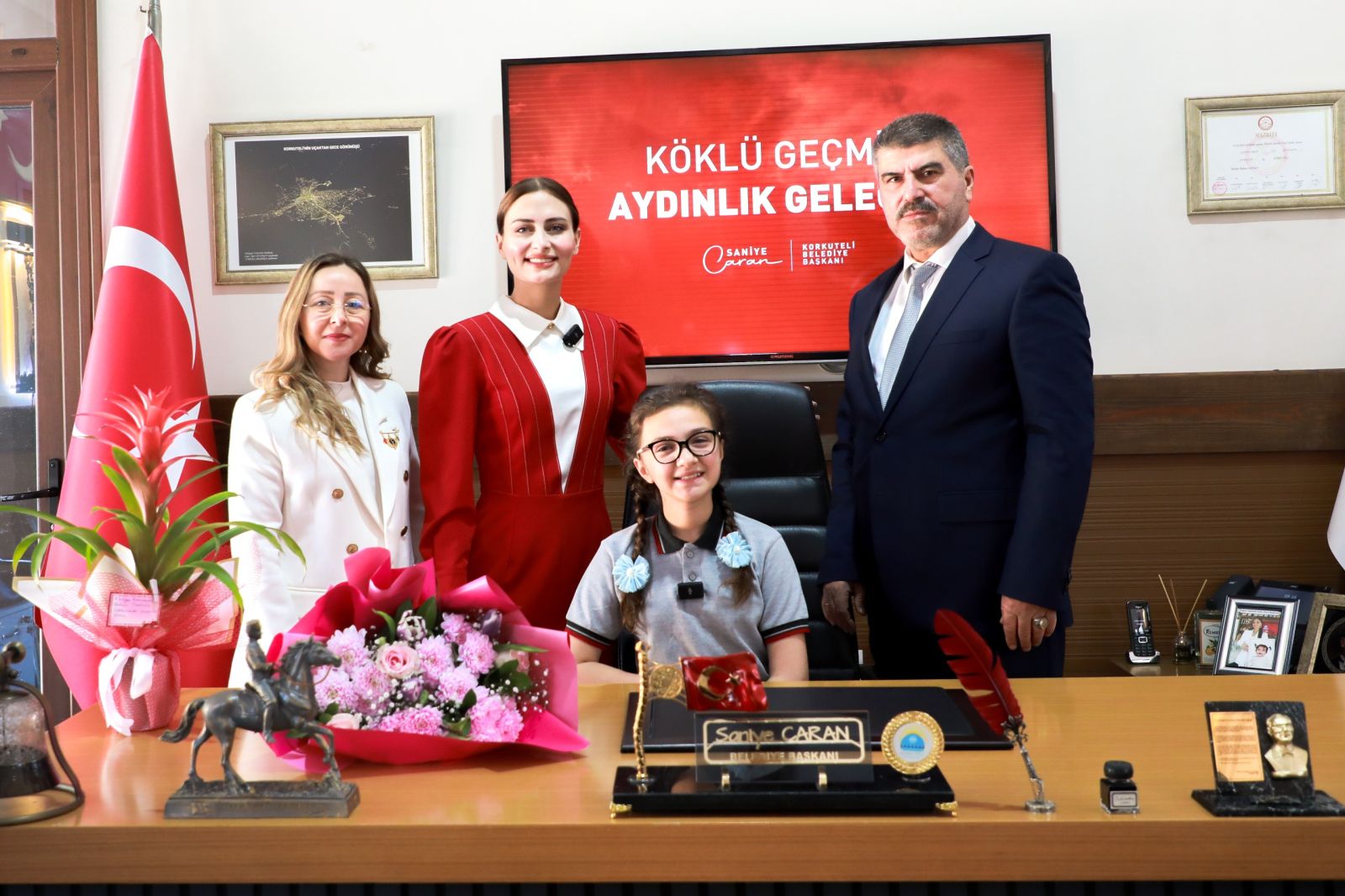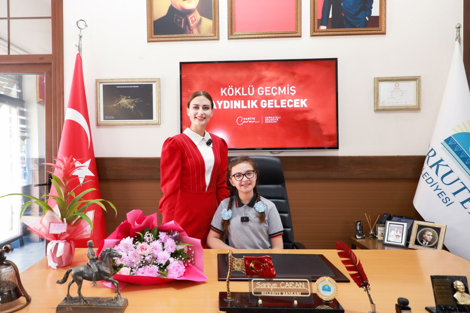 23 Nisan Ulusal Egemenlik ve Çocuk Bayramı’nın coşkusu, Korkuteli Belediye Başkanlığı makamında düzenlenen anlamlı devir teslim töreniyle başladı. Belediye Başkanı Saniye Caran, büyük bir gururla makam koltuğunu geleceğin teminatı olan küçük başkana emanet etti.