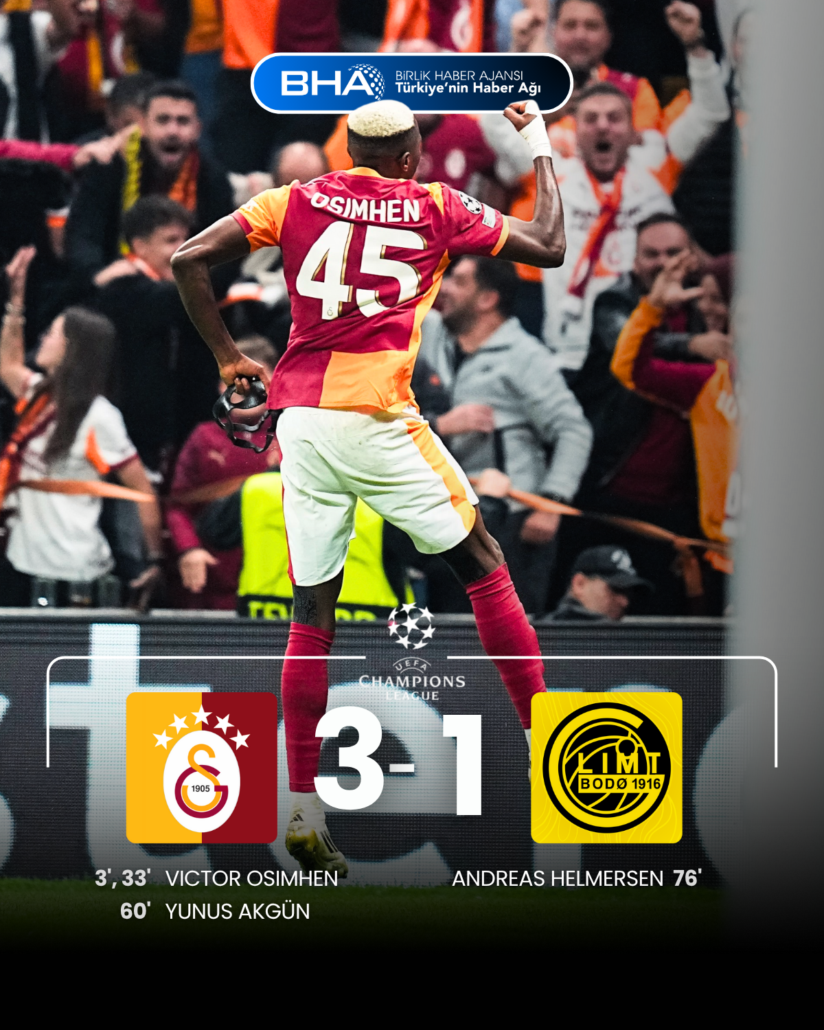 UEFA Şampiyonlar Ligi’nde üçüncü haftaya damgasını vuran Galatasaray, Norveç temsilcisi Bodo/Glimt’i RAMS Park’ta 3-1 mağlup ederek puanını 6’ya yükseltti. Tribünleri tamamen dolan taraftarının desteğini arkasına alan sarı-kırmızılılar, Osimhen ve Yunus Akgün’ün golleriyle sahadan galip ayrıldı.